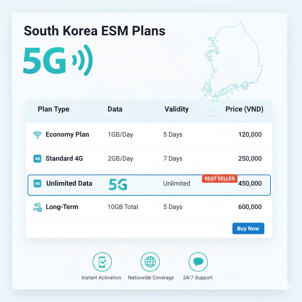 Đối tác nhà mạng lớn: Hãy chọn các bên cung cấp eSIM từ các nhà mạng hàng đầu Hàn Quốc như SK Telecom (SKT), KT Corporation (KT), hoặc LG U+. Điều này đảm bảo sóng 4G/5G luôn “căng đét” dù bạn ở Seoul hay đảo Jeju.
